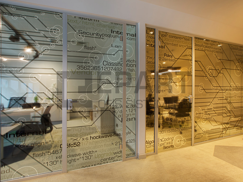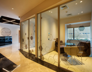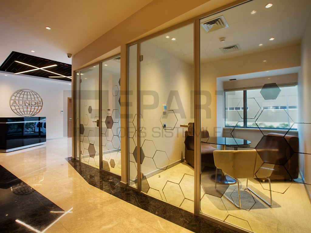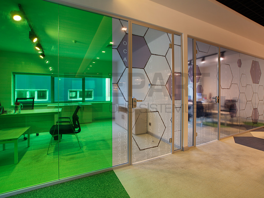 Translucency and visual depth can be achieved using colored film or sand film in a single glass partition system.