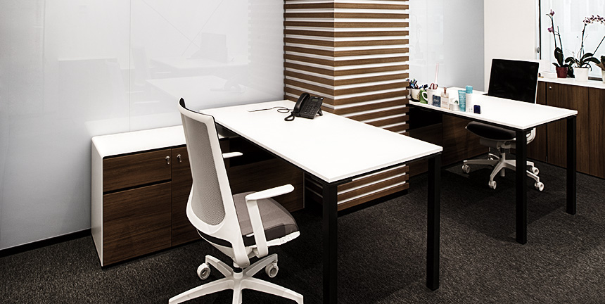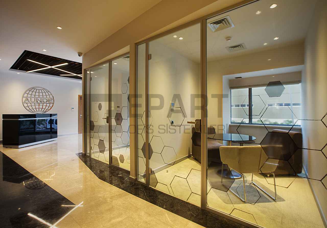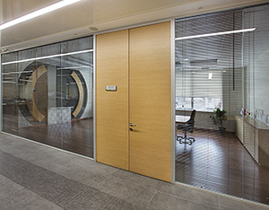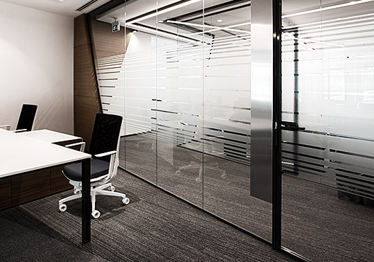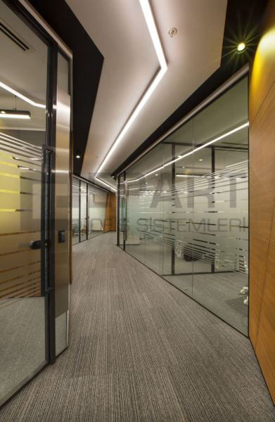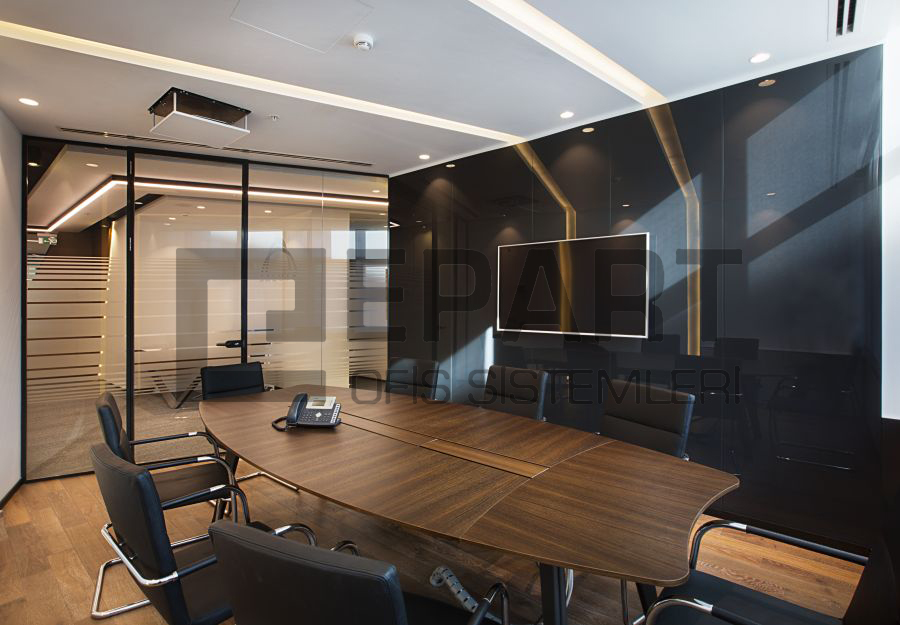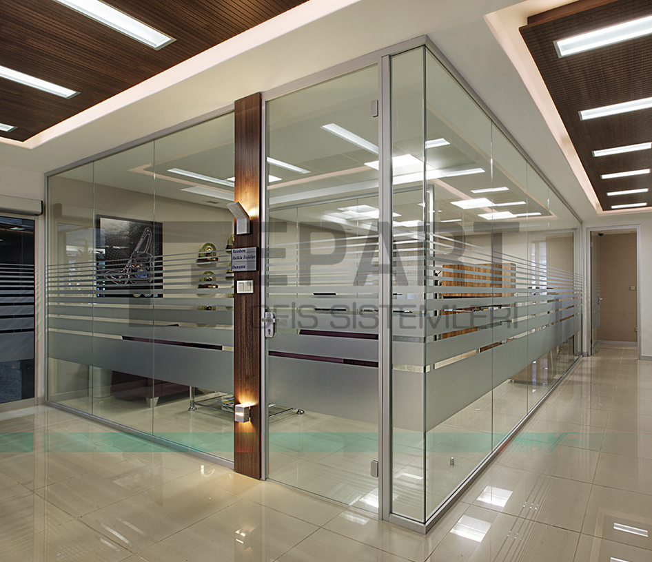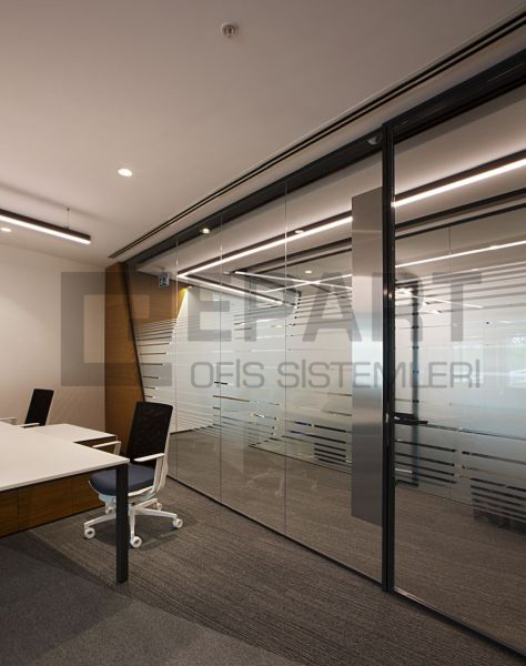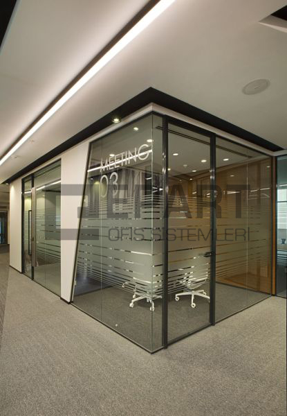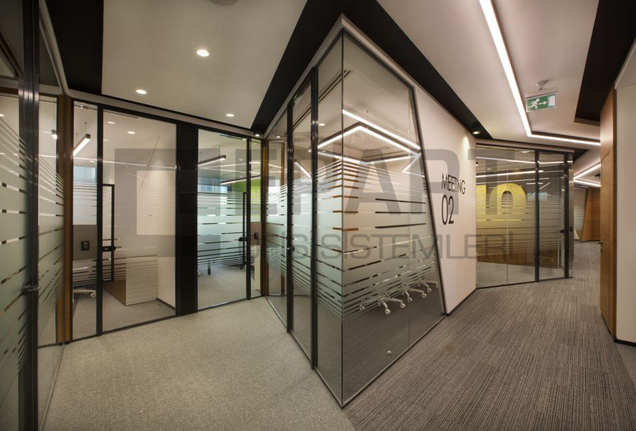 The system is designed with visual simplicity in mind for intense work pace. This is solved by the minimum profile thickness of the walls, ceiling and floor, ensuring the simplicity of the space.
