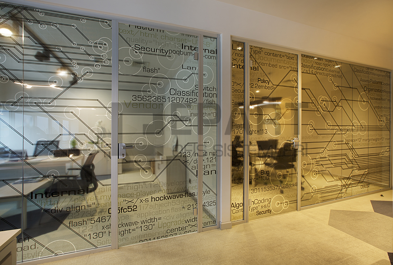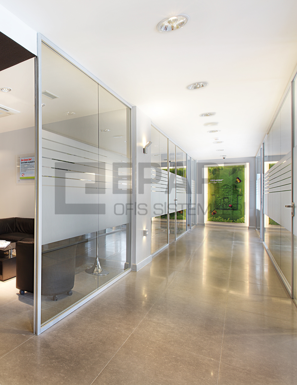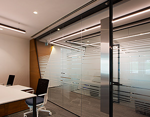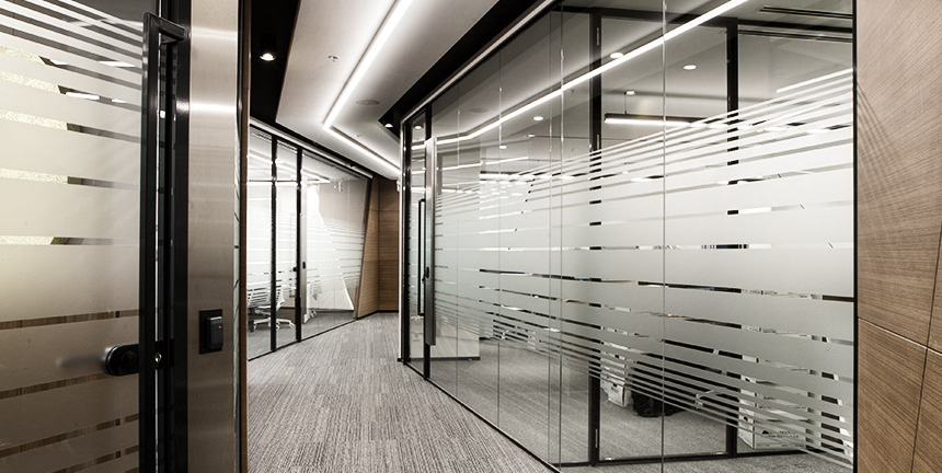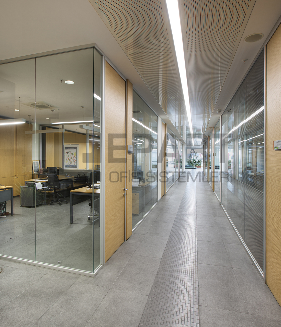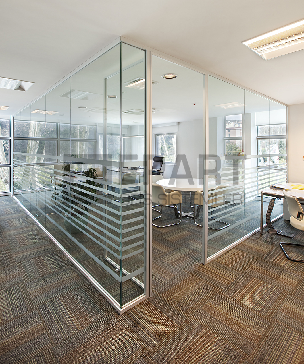 The system is designed with visual simplicity in mind for intense work pace. This is solved by the minimum profile thickness of the walls, ceiling and floor, ensuring the simplicity of the space.